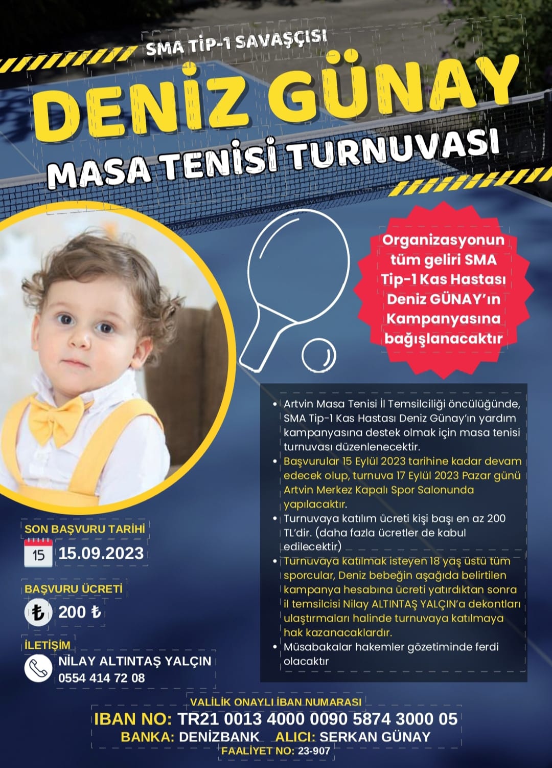Artvin ililnde SMA TİP-1 ölümcül kas hastası olan bebeğimizin tedavisi için valilik izni ile birlikte bir kampanya düzenleyip turnuvanın tüm kazancı deniz bebeğe aktarılacaktır